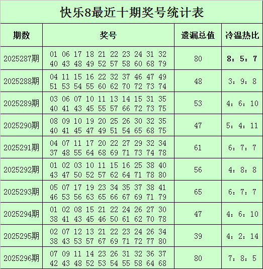 福彩欣忭8第2025296期开奖回来:07 09 11 14 23 26 31 32 36 37 42 43 48 52 53 54 55 58 64 68,其中冷温热码比为3:11:6,遗漏总值为80。