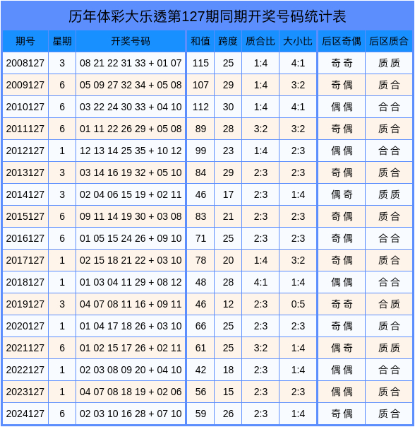 大乐透积年第127期奖号数据分析统计