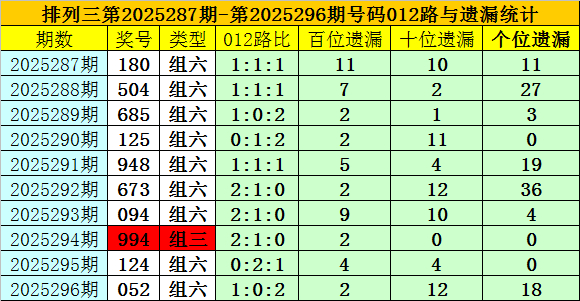 开奖回顾:陈设三第2025296期奖号为:052,类型为组六,号码012路比为1:0:2,百十个位号码直选永别遗漏2期、12期和18期。
